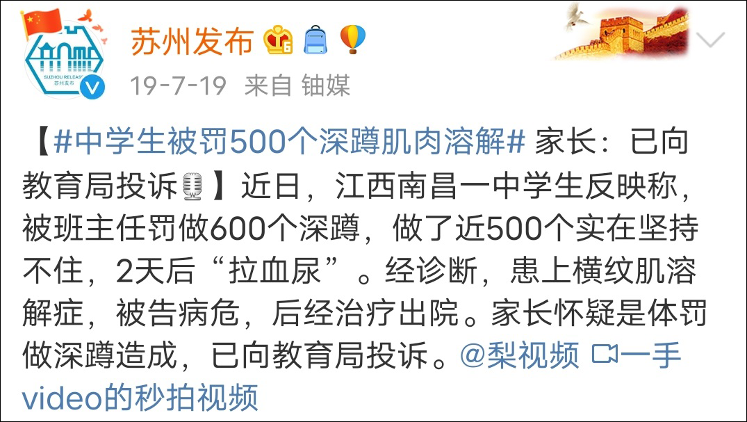 15歲女孩被罰做200個深蹲後橫紋肌溶解 教體局:對涉事教師通報批評_風聞