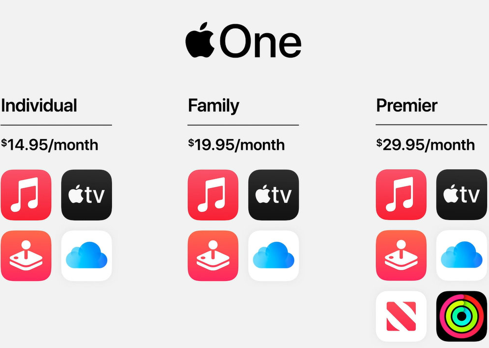 Apple One的收費標準為:個人套餐月費 14.95 美元,包含Apple TV+、Music、Arcade以及擴增50G的iCloud空間;家庭套餐月費 19.95 美元,包含Apple TV+、Apple Music、Apple Arcade以及擴增200G的iCloud空間;高級訂閲服務月費為 29.95 美元,增加了Apple Fitness 、News和2T的iCloud空間。