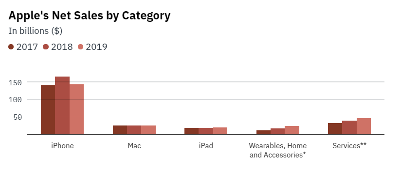 2019年,蘋果服務收入比前一年增長了16% ,達到460億美元,但仍然只佔蘋果全年總銷售額的18% 。與此同時,iPhone 帶來的入賬超過了五成,佔蘋果總收入的55% 。