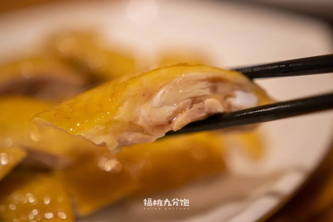 他家的白切雞 “過了冰河”,整雞煮熟,冰水鎮過之後再切塊,皮脆肉嫩,皮下油脂凝成一層淡淡啫喱——