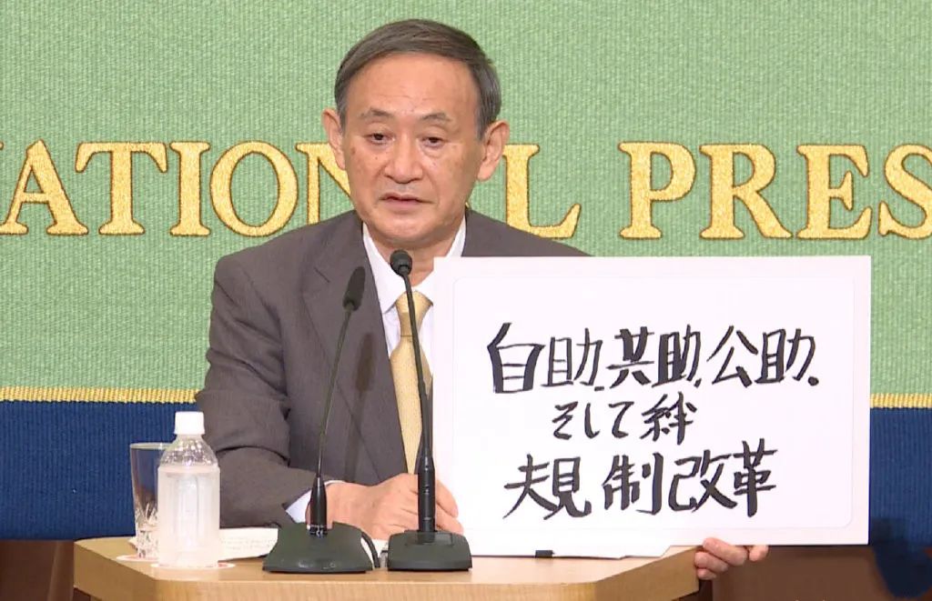 可能覺得全盤接受安倍政治有點不太好吧,菅義偉在自己的博客中寫道要建立**“建設自助、共助、公助的值得信賴的國家”**。好不容易提出的這一口號被日本媒體批評為:好像是在高校的社會科學教材中抽象出的一個詞,而非一位資深政治家的政治理念。