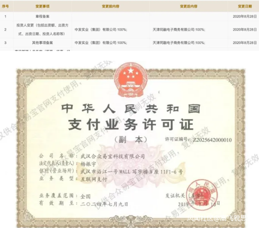 2020年8月底,天津同融電子商務公司實現了對第三方支付機構武漢合眾易寶科技公司的100%控股。這個天津同融實控人為字節跳動創始人張一鳴。這則工商變更意味着字節跳動如願以償地拿到了夢寐以求的支付牌照。