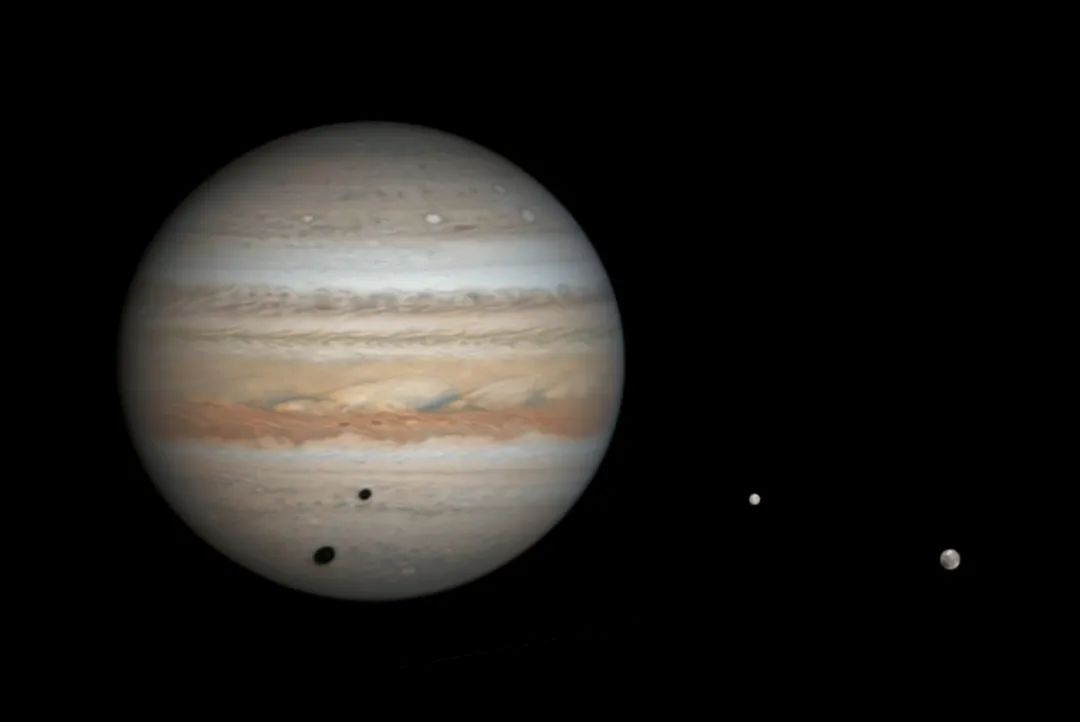 圖為木衞三(最大的伽利略衞星)和木衞二(最小的伽利略衞星)以及它們在木星表面投下的影子,新發現的天體在離木星更遠的軌道上