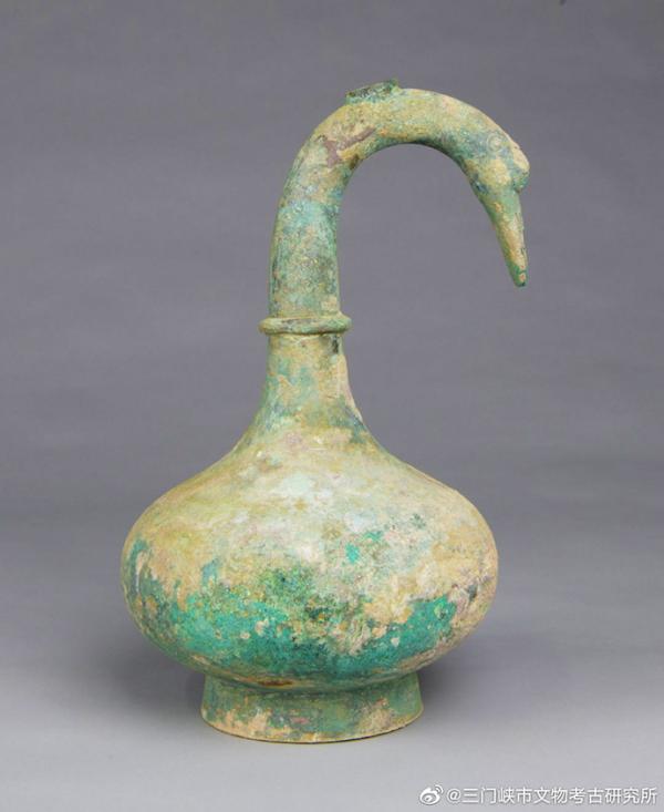 三門峽被譽為“天鵝之城”,每年都有近萬隻白天鵝自西伯利亞遷徙到當地的黃河濕地過冬。鵝首曲頸青銅壺的出土,為這一美名增添了文化底藴。