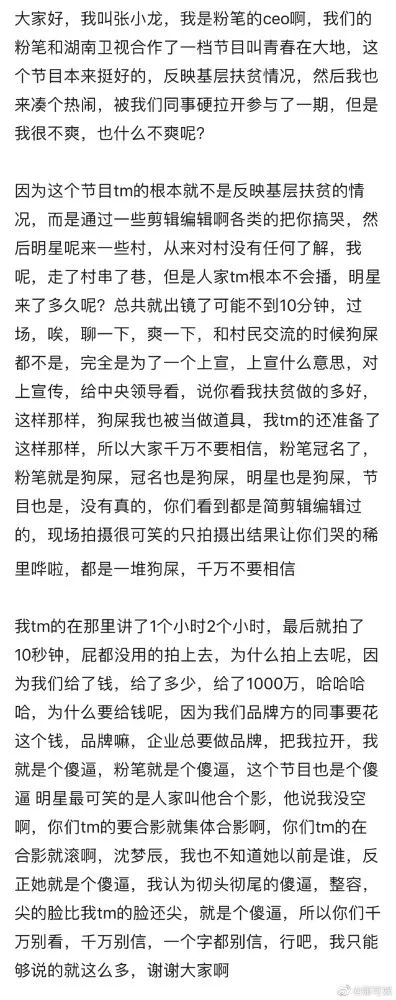 我是一直到“張小龍道歉”,才看到張小龍大罵湖南衞視扶貧節目的視頻的。