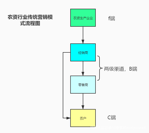 其次,農資行業非常依賴傳統的渠道營銷模式,即從企業到經銷商到零售商再到農户的模式,如圖所示: