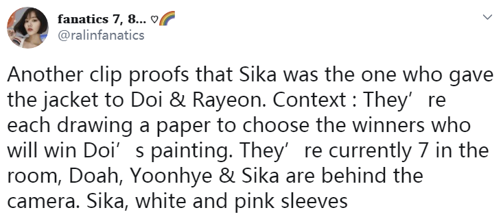 “直播現場當時有7個人,Doah, Yoonhye 和 Sika都在鏡頭外,Sika的袖子是粉白相間的。”