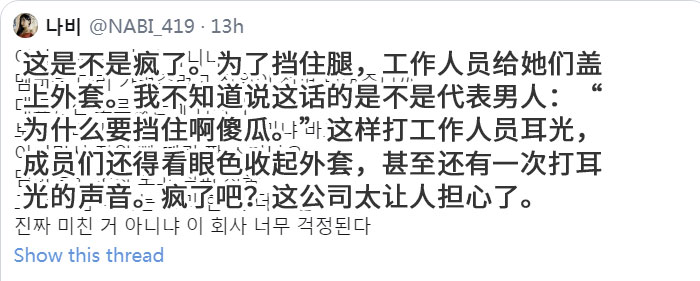 據《朝鮮日報》9月17日報道,7日直播時,為防止走光,兩位女團成員剛接過隊友遞來的外套蓋在腿上,背景中就出現了一位男性的斥責聲:“蓋什麼?就是要露出來啊,給別人看腿啊,你傻嗎?”女藝人聽後看眼色將外套移開。