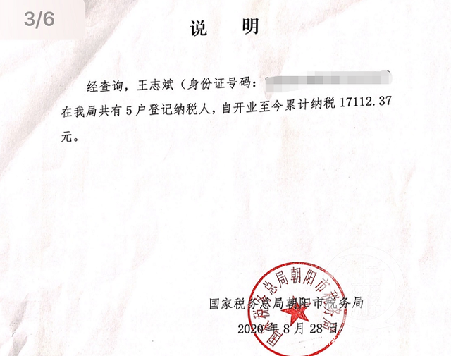 朝陽市税務局出具《説明》,王志斌在該局共有5户登記納税人,自開業至今累計納税17112.37元/受訪者供圖