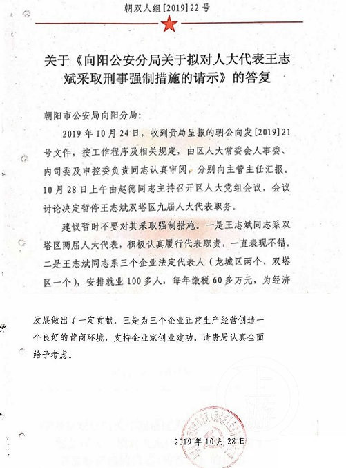 記者瞭解到,2019年10月22日,朝陽市公安局向陽分局擬對王志斌採取刑事拘留措施,因其為雙塔區人大代表,而向雙塔區人大常委會去函詢請示能否對王志斌採取刑事強制措施。