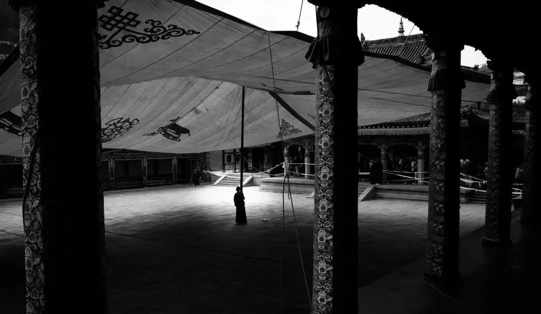 當時在塔爾寺裏兜來轉去,突然一個區域在清場,説是寺裏的喇嘛準備會考了,參觀人員都要回避,我就慢慢地往外走,看見他們一羣人在撐一個幕布,遮擋太陽。