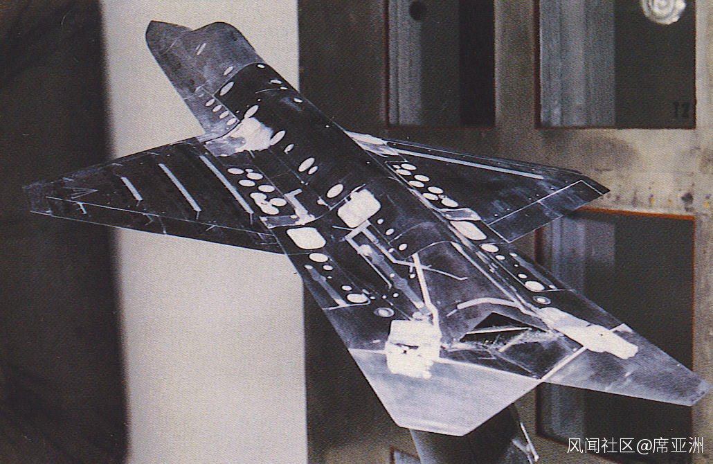 某個風洞模型,這個設計其實已經接近於小展弦比三角翼加一對蝶形翼,用矢量推力控制,發動機氣流還吹過水平尾翼用來增加舵效,可見美國在氣動佈局研究方面也是在考慮各種靠譜和不靠譜的設計方案