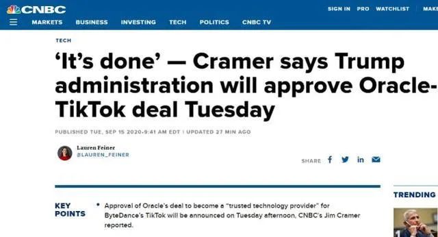 最後迷霧揭開,TikTok與甲骨文之間談的不是收購案,而是數據安全的合作條款。根據美國權威媒體CNBC的報道,川普政府即將批准這一合作。在TikTok這件事上,川普終於要妥協了。