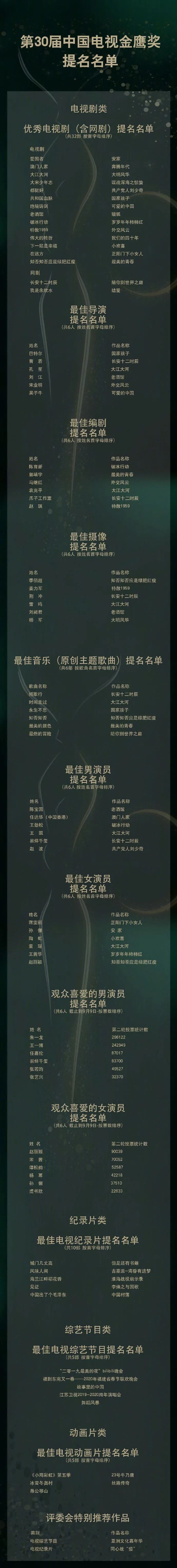 昨晚,福建廈門現場,第30屆金鷹獎提名名單正式揭曉。不同於往年,今年的金鷹獎提名發佈會不僅首次採用“線上線下”同步播出模式,還在評選內容上新增了獎項評選。