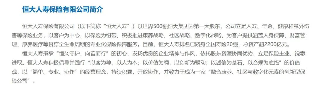 2015年,恒大斥資39.39億元競得中新大東方人壽保險公司50%股權,並將其更名為恒大人壽,模式則是以壽險為核心,集養老、醫療、健康等配套服務為一體的綜合保險供應商。