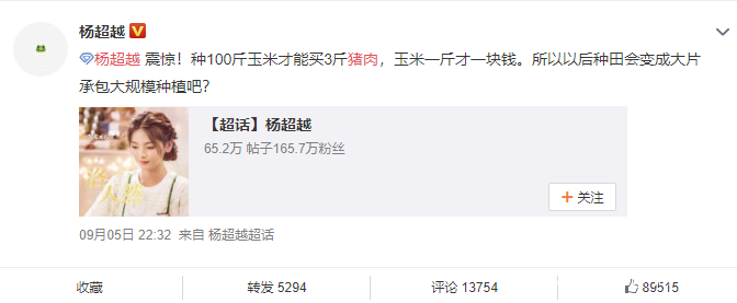 要是算玉米從農民手裏收購的價錢和豬肉在超市裏零售的價錢,她這番話還是挺有道理的。