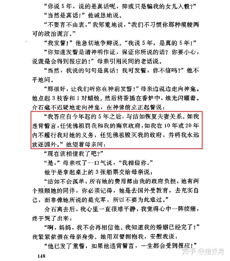 “自今日起5年之內,必定恢復與潔如的婚姻關係。如果違反誓言,沒有將她接回,祈求我佛將我殛斃,將我的南京政府打成粉碎。如果10年20年之內,我不對她履行我的責任,祈求我佛推翻我的政府,將我放逐於中國國外,永不許回來。”