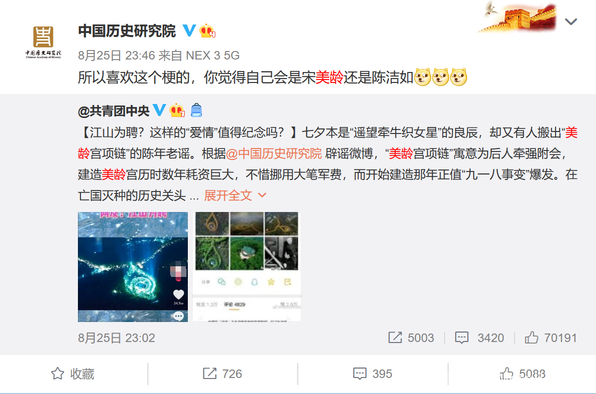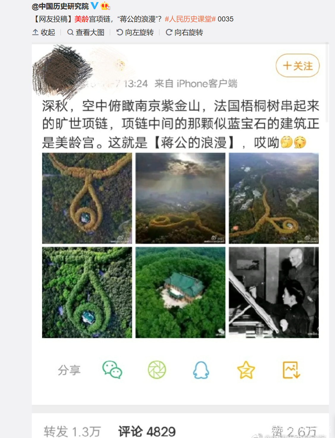 七夕節,南京美齡宮在梧桐樹“項鍊”上點燈,網絡流傳着所謂【蔣公的浪漫】、【江山為聘】,於是,微博大V@中國歷史研究院出來闢謠: