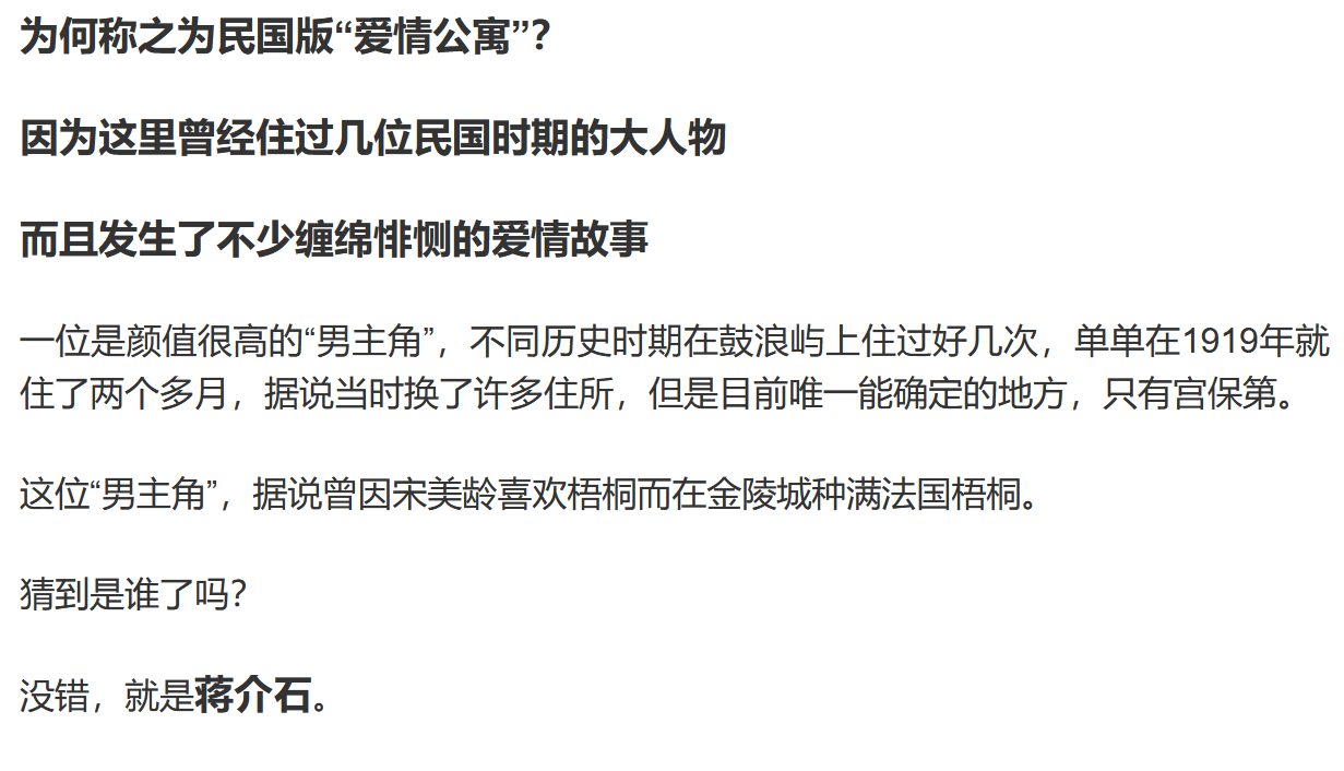 【廈門有座“愛情公寓”?】“愛她就為她在南京種滿梧桐?”實際上南京大規模種梧桐是為了迎接孫中山先生歸葬紫金山。另,1919年時年32歲的蔣介石確實遇到了“愛情”,那個女孩13歲,叫陳潔如。