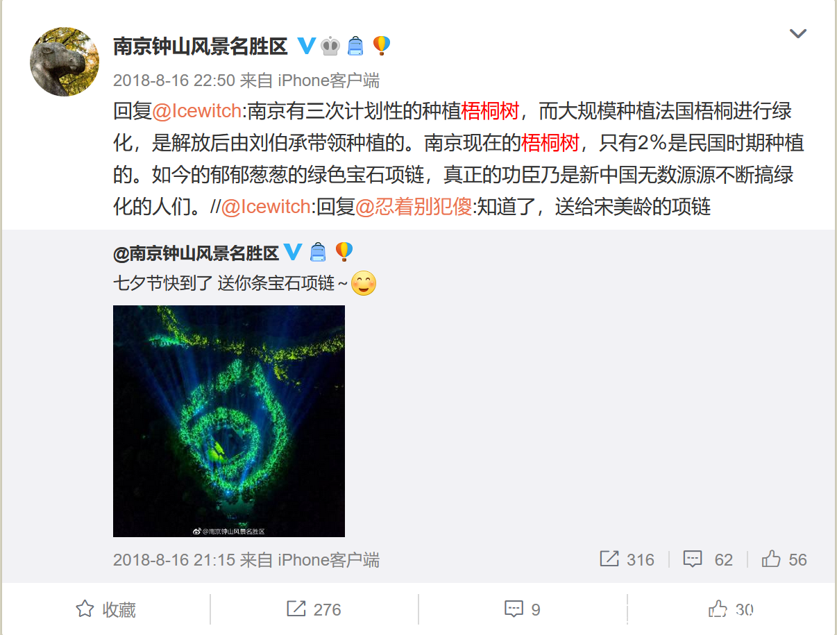 據@南京鐘山風景名勝區微博:南京有三次計劃性的種植梧桐樹,而大規模種植法國梧桐進行綠化,是解放後由劉伯承帶領種植的。南京現在的梧桐樹,只有2%是民國時期種植的。如今的鬱鬱葱葱的綠色寶石項鍊,真正的功臣乃是新中國無數源源不斷搞綠化的人們。