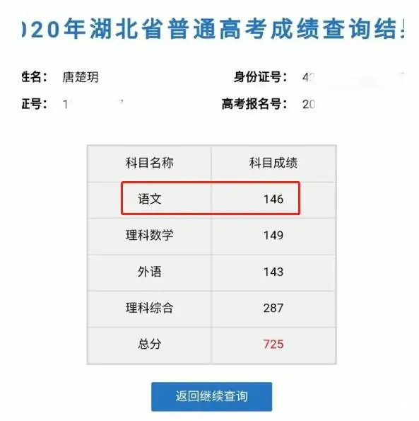 在2020年高考中,這個叫唐楚玥的女孩,考了725分,成為了2020年湖北省高考“狀元”。其中語文146分、數學149分、外語143分、理科綜合287分,是今年湖北高考理科第一名,目前已就讀於北京大學元培學院。