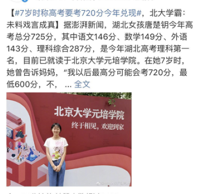 女孩7歲時稱高考要考720分,十一年後不小心還考多了5分_風聞