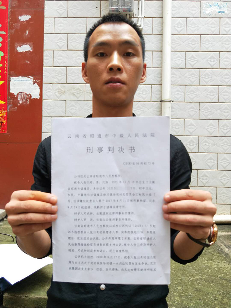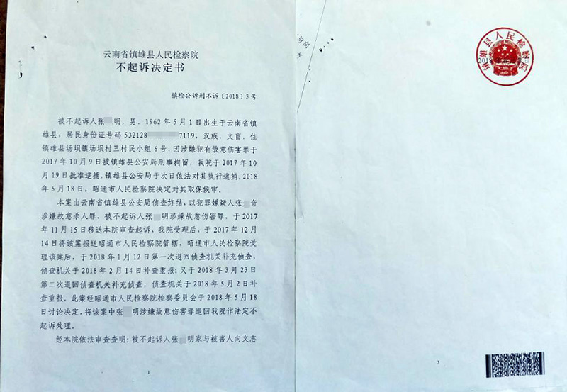 嚮明錢説,張某奇被押回鎮雄縣一個多月後,其兄張某明也被警方抓捕歸案。案發時,張某明將嚮明錢的姐夫王建祥背部砍傷,經法醫鑑定為輕傷二級,但警方一直並未對其採取任何措施。