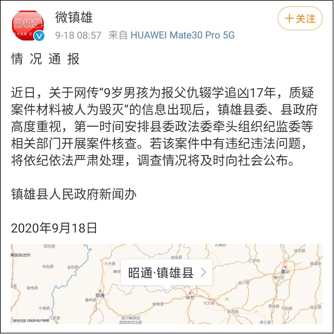 9月18日鎮雄縣人民政府新聞辦發佈情況通報,稱鎮雄縣委、縣政府高度重視該案,已經第一時間安排縣委政法委牽頭組織紀監委等相關部門開展案件核查,調查情況將及時向社會公佈。