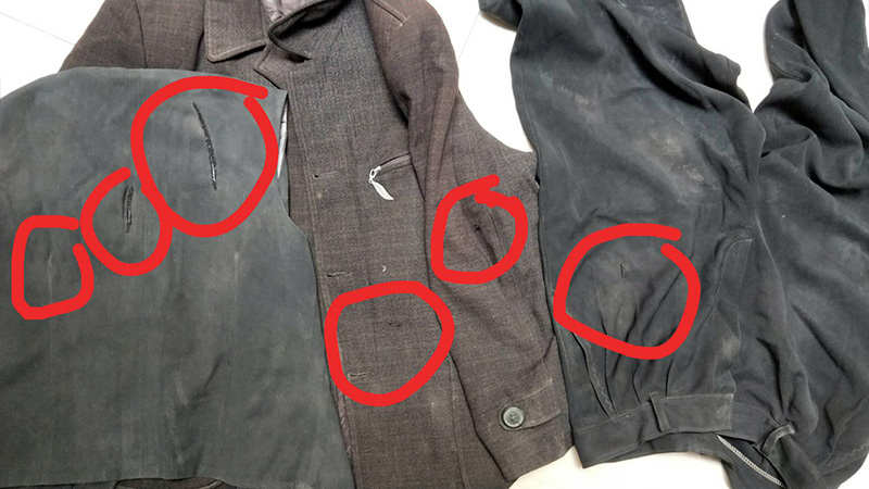 (嚮明錢父親向文志被砍殺時所穿衣服上的創口 來源:猛獁新聞•東方今報)
