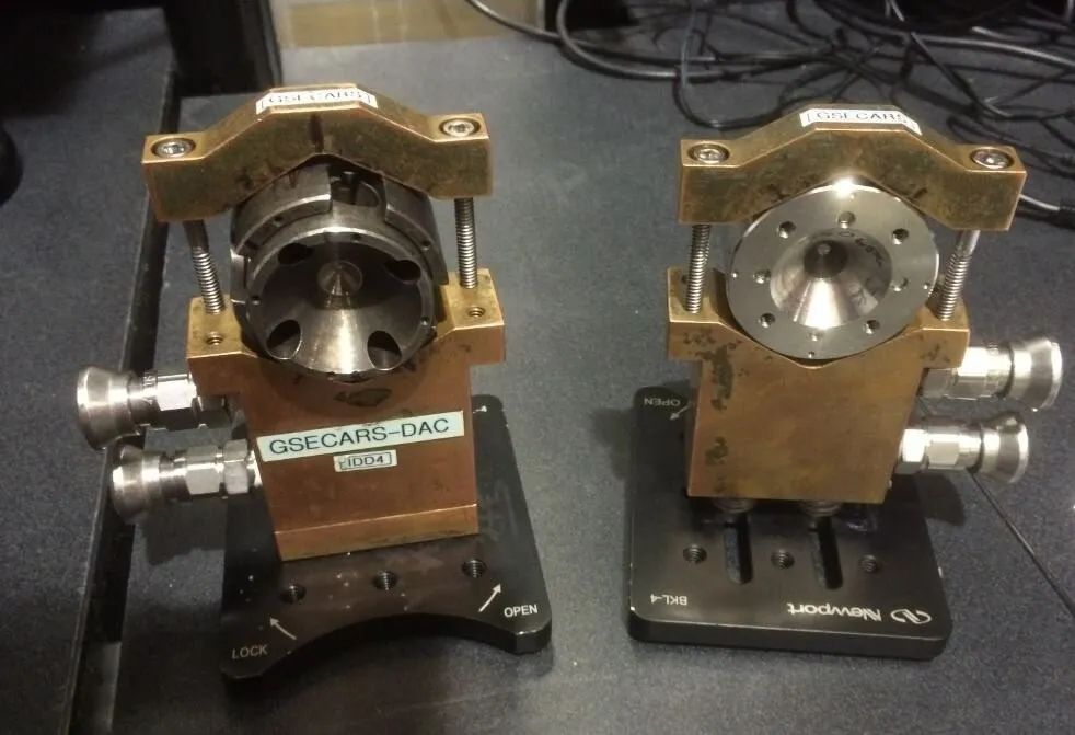 這張照片中的圓柱狀物體是金剛石壓腔。將金剛石壓腔安裝在銅支架中,然後插入同步加速器的X射線/激光束路徑中。這張照片顯示了金剛石壓腔和底座在進行X射線/激光實驗進行對準之前的位置。圖片來源:Shim / ASU