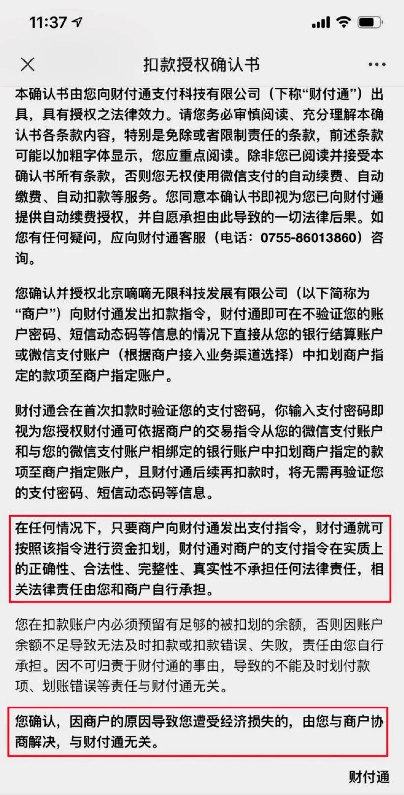 柒財經注意到,據微信《扣款授權確認書》顯示,在任何情況下,只要商户向財付通發出支付指令,財付通就可按照該指令進行資金扣劃,財付通對商户的支付指令在實質上的正確性、合法性、完整性、真實性不承擔任何法律責任,相關法律責任由用户和商家自行承擔。