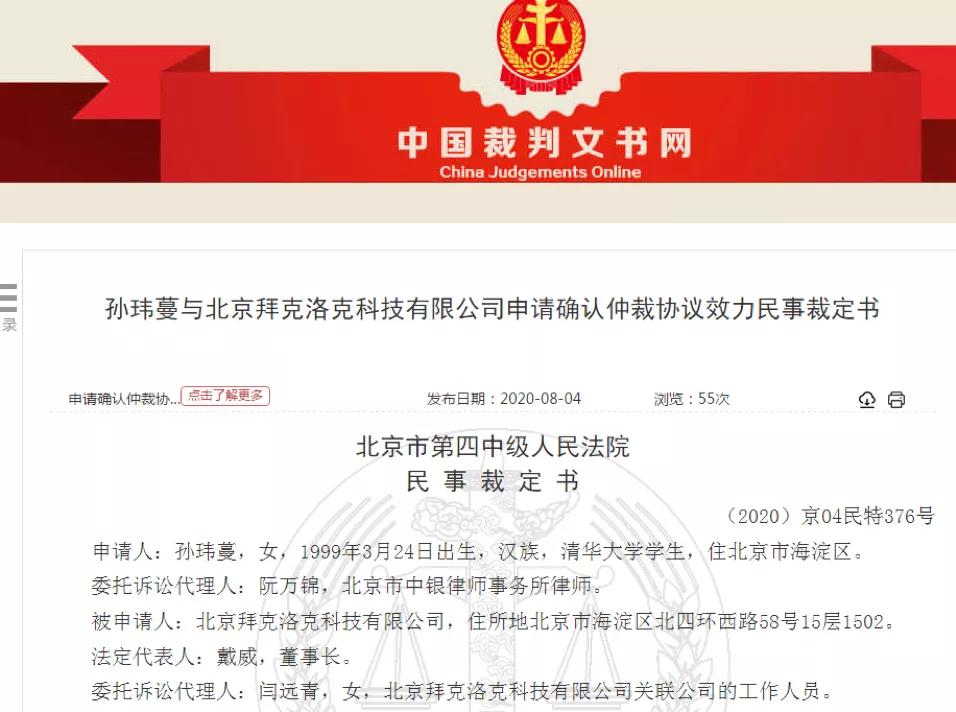柒財經瞭解到,在上個月,中國裁判文書網掛出《孫某與北京拜克洛克科技有限公司申請確認仲裁協議效力民事裁定書》(下稱《裁定書》)。