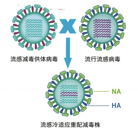 科學家通過對流感病毒不斷培養和篩選,找出一種冷適應病毒。這種病毒只能在温度較低的上呼吸道繁殖,不會在接近體温的下呼吸道繁殖,這就導致其幾乎失去了致病性,只保留了感染性。科學家找到導致冷適應的6個關鍵基因,將其做為活疫苗的骨架。
