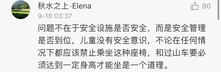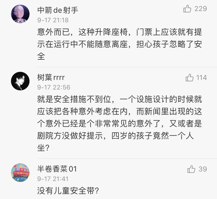 對此,網友認為,升降座椅對觀眾的安全意識有要求,劇場應該做好對兒童乘坐該座椅的看管措施。