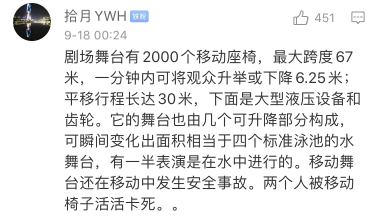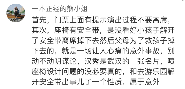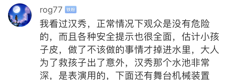 但有部分在漢秀看過演出的網友現身説法,稱劇場有安全提示、座椅也有安全帶,事故原因有待考量。