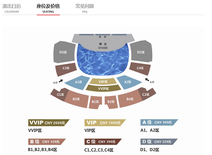 漢秀劇場的座位分為多個區域對外售票,價格為229元-2699元不等,共有6檔。