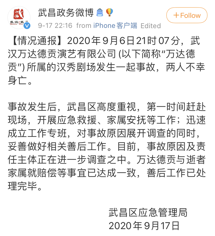 17日深夜,武漢市武昌區官方微博@武昌政務微博 就此事發布情況説明,事故發生在9月6日,已成立工作專班對事故原因展開調查,萬達德貢與逝者家屬就賠償等事宜已達成一致,善後工作已處理完畢。