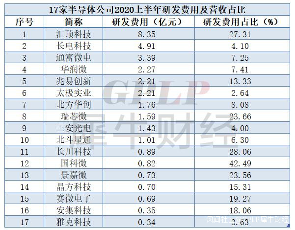 作為技術密集型的行業,這些半導體企業的研發支出顯得尤為重要,據GPLP犀牛財經統計,這17家企業當中有近六成企業研發費用超億元,其中匯頂科技上半年的研發費用為8.35億元,營收佔比為27.31%,這也是其上半年淨利潤下降的一大原因。