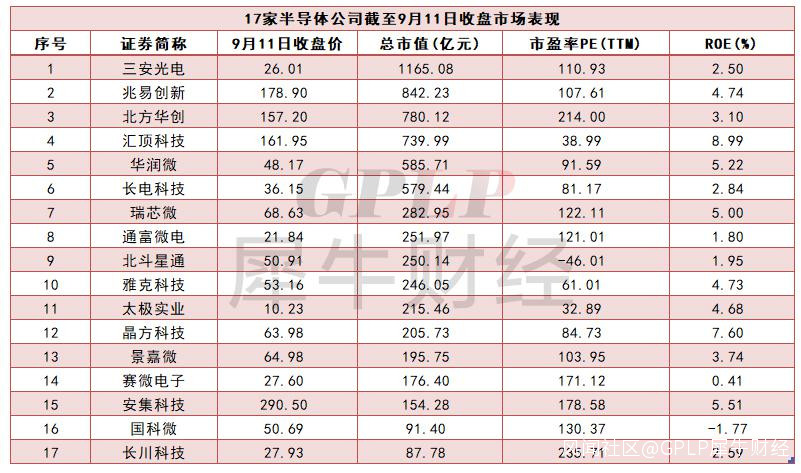 截至2020年9月11日收盤,這17家半導體企業合計總市值達6850.48億元,平均市盈率(TTM)高達108.22倍,平均ROE僅為3.74%。