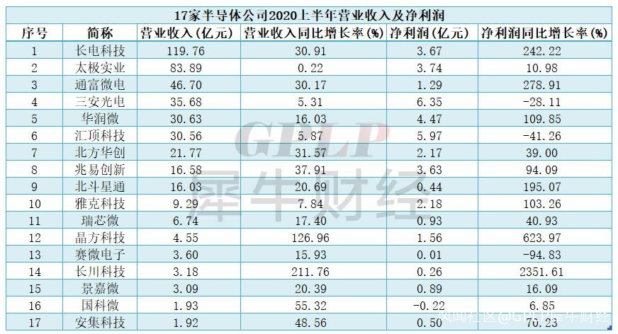 GPLP犀牛財經統計中報數據發現,從半年報數據來看,這17家半導體企業營業收入均實現增長且盈利,僅國科微(300672.SZ)一家出現虧損。