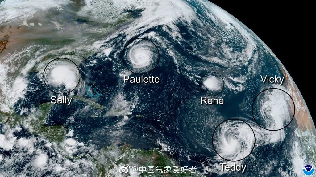 這張雲圖上從左到右分別為莎莉、泊萊特、雷妮、泰迪、維姬。如此盛大的颶風Party,確實罕見。