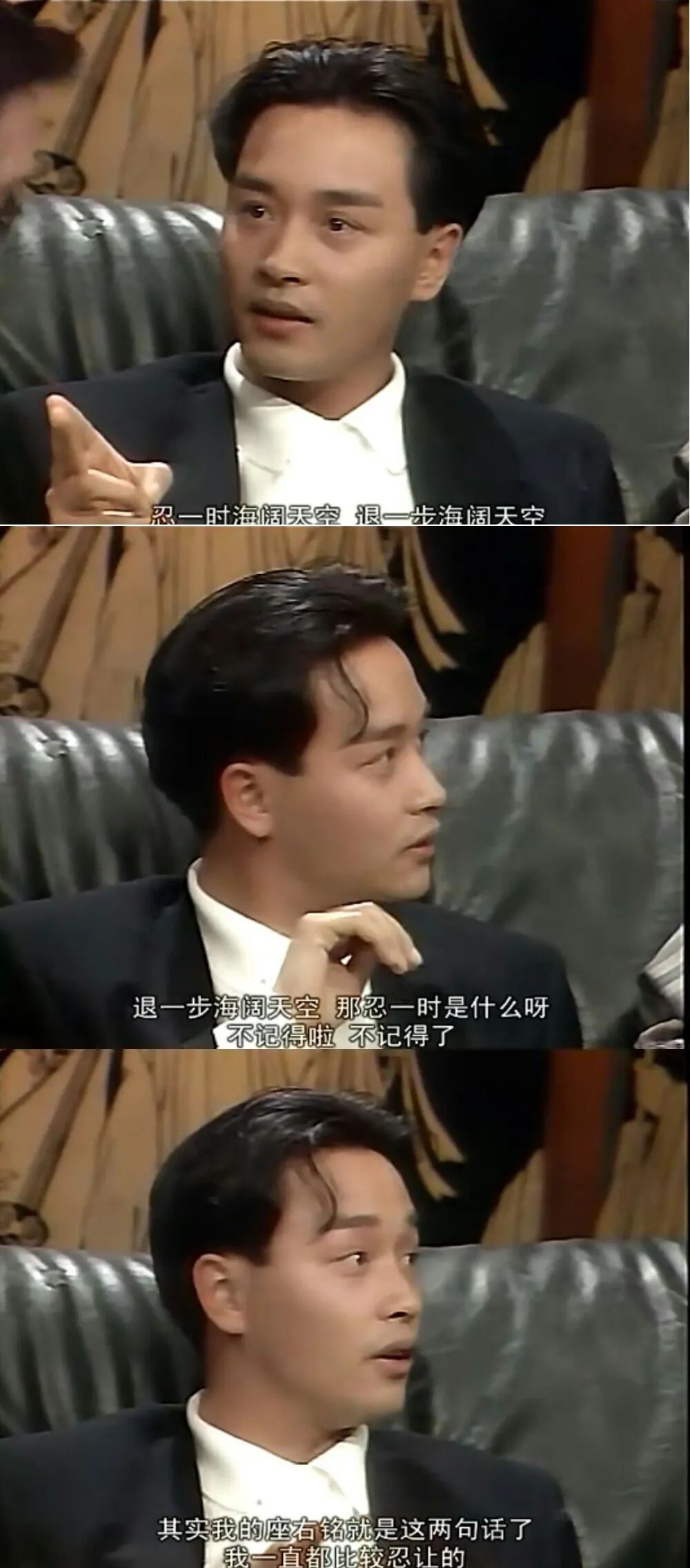 在黃霑、倪匡、蔡瀾主持的《今夜不設防》裏,他説自己的座右銘是“忍一時風平浪靜”,説着説着結果忘了後半句是什麼。