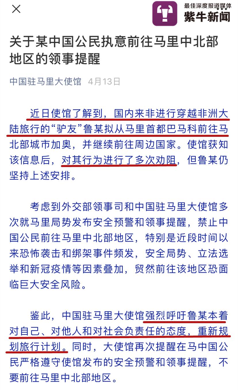4月13日,中國駐馬裏大使館發佈《關於某中國公民執意前往馬裏中北部地區的領事提醒》。文中稱,“國內來非進行穿越非洲大陸旅行的‘驢友’魯某擬從馬裏首都巴馬科前往馬北部城市加奧,並繼續前往周邊國家。使館獲知該信息後,對其行為進行了多次勸阻,但魯某仍堅持上述安排。”強烈呼籲其“重新規劃旅行計劃”。
