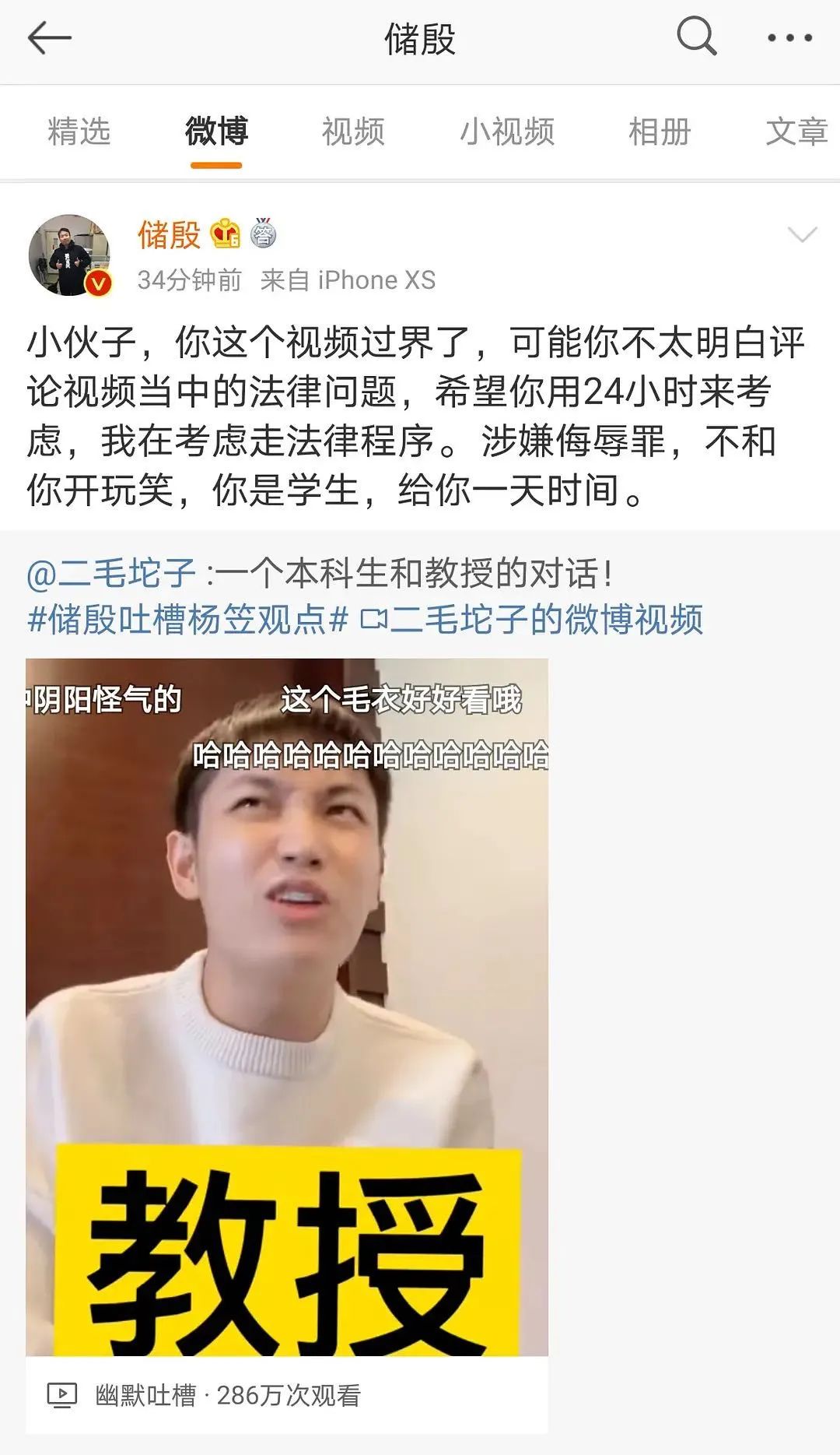 微博搞笑博主二毛坨子,用短視頻回懟儲殷的觀點。其中就有“我們用化妝來掩蓋醜,就像你通過吃藥來掩飾自己軟。”被激怒的儲殷揚言要告二毛坨子侮辱罪,並給出了24小時期限。