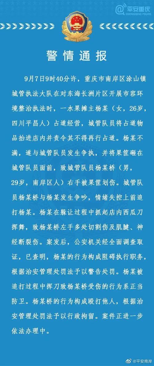 9月13日,重慶市公安局南岸區分局在微博上發佈了一則通報: