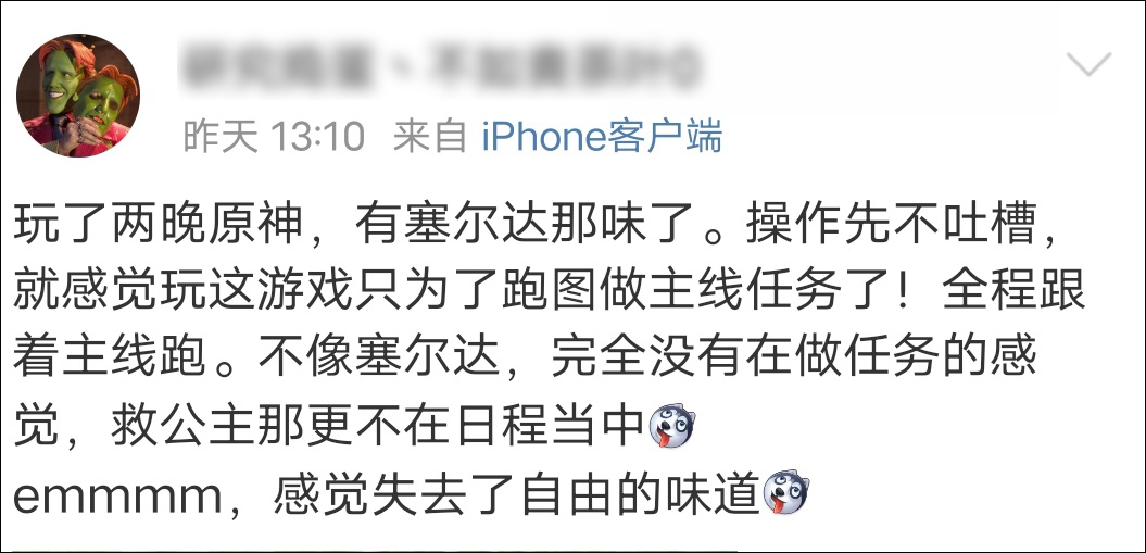 在一個開放的遊戲市場環境下,接觸過《塞爾達傳説》的玩家,自然希望《原神》可以做得很好。並不是”國外的月亮比國內的圓“,而是期待越大、落差越大,玩家的失望就會越大。難免就有網友跑來吐槽:
