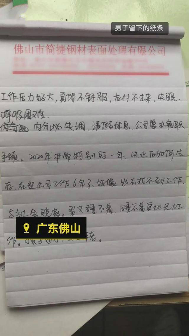 近日,廣東佛山一男子請假被拒後在工廠自殺身亡,留下紙條稱自己“工作壓力大,身體不適”一事引發關注。