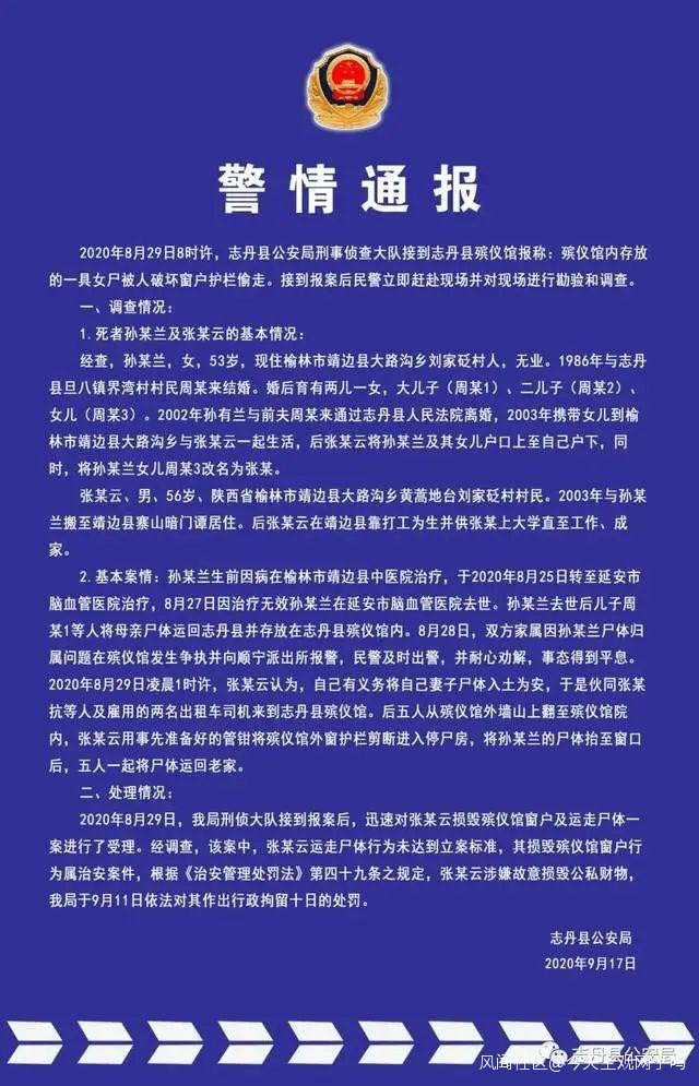 今天(19日)零時,陝西省志丹縣公安局發佈警情通報稱,2020年8月29日8時許,陝西志丹縣公安局刑事偵查大隊接到志丹縣殯儀館報稱:殯儀館內存放的一具女屍被人破壞窗户護欄偷走。接到報案後民警立即趕赴現場並對現場進行勘驗和調查。