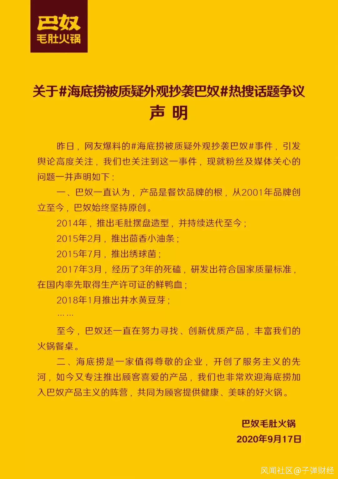 2、服務主義與產品主義的交鋒在外界議論紛紛時,9月17日,巴奴對此次涉嫌被抄襲事件進行了回應:“我們也非常歡迎海底撈加入巴奴產品主義的陣營,共同為顧客提供健康、美味的好火鍋。”