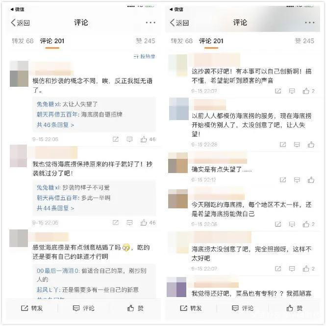 火鍋和海底撈無愧是餐飲界首屈一指的大IP,這篇文章發出後,引發網友熱烈討論。有的人站這名海底撈粉絲,“海底撈自砸招牌”,“海底撈保持原來的樣子就好了!抄襲就過分了吧!”“海底撈有點創意枯竭了嗎”……一系列對海底撈的質疑接踵而來。